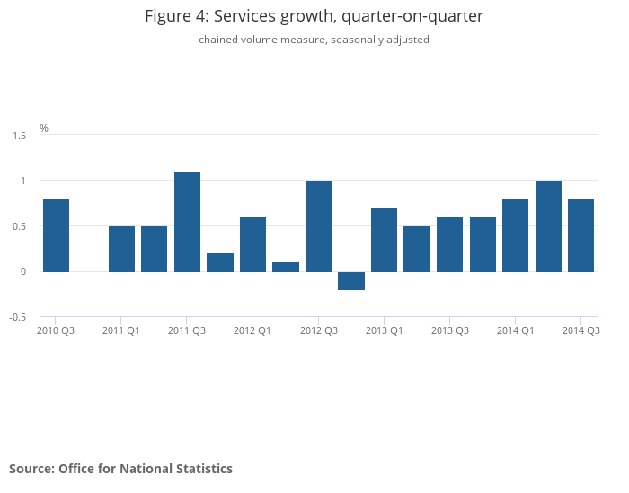 The service industries grew by 0.8% in Q3 2014 (see Figure 4), unrevised from the previous estimate, marking the seventh consecutive quarter of positive growth. This follows a 1.0% increase in Q2 2014. The increase in the latest quarter was broad-based; the largest contributions coming from the business services & finance and transport, storage & communications industries, which grew by 1.0% and 1.2% respectively.