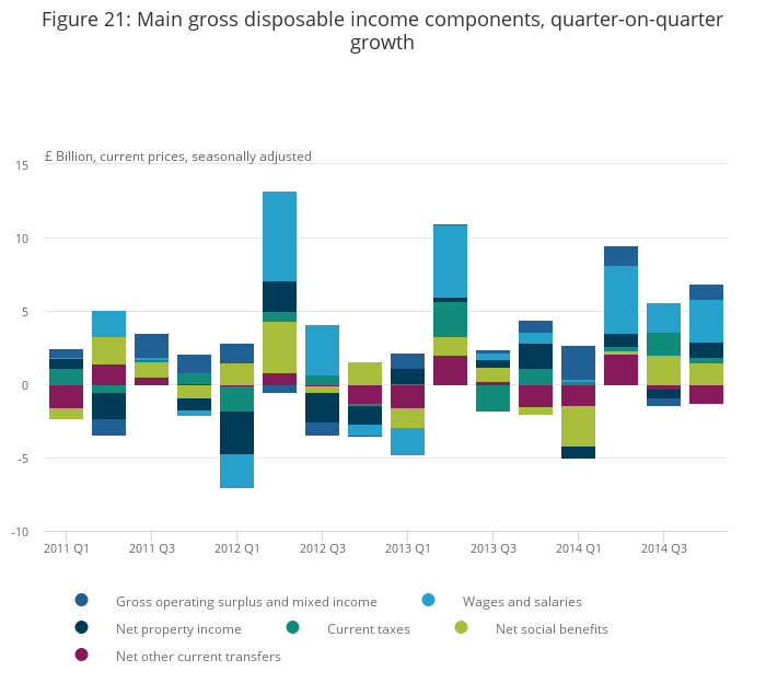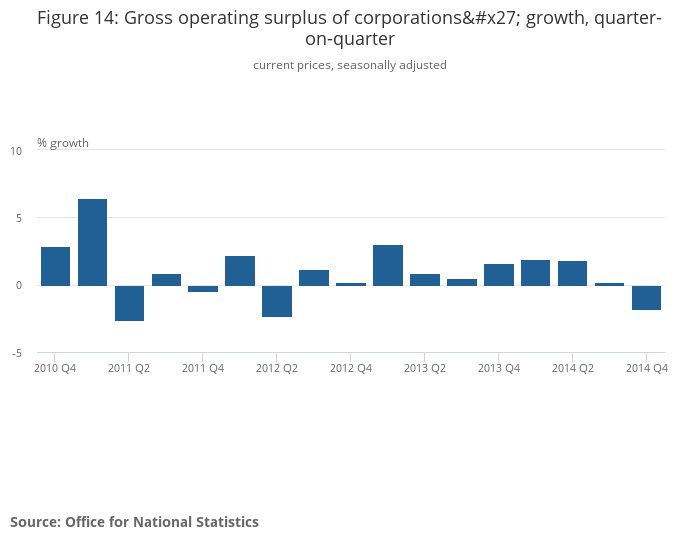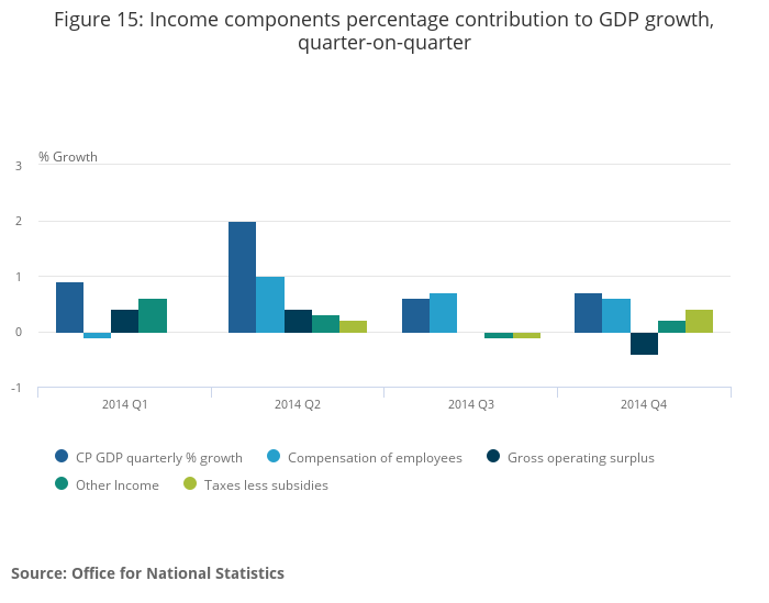 GDP for Quarter 4 (Oct to Dec) 2014 has been revised up by 0.1 percentage points to 0.6%. This is due to upward revisions for the services industries within the output approach to measuring GDP from the business services and finance industries. This was due to actual returns from external data sources replacing forecast data within the financial services and insurance services industries. There were also upward revisions to the income approach to measuring GDP for financial corporations’ gross operating surplus, again due to external data sources replacing forecast data used in the previous publication, in particular within the insurance and pension industries.