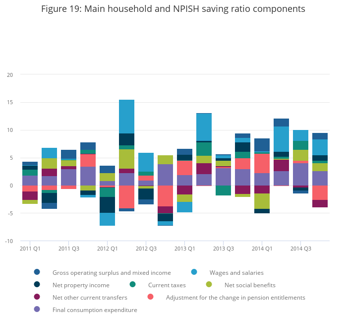 Household saving ratio % | Real household disposable income % (1) | Current market prices 2011=100 | Chained volume measure 2011=100 | Chained volume measure % (1) | |