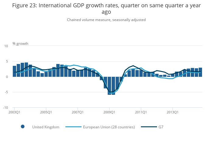 From Quarter 3 2009 growth continued to be erratic, with several quarters between 2010 and 2012 recording broadly flat or declining GDP. This 2 year period coincided with special events (e.g. severe winter weather in Quarter 4 (Oct to Dec) 2010, the Diamond Jubilee in Quarter 2 2012) that are likely to have affected growth both adversely and positively. Since 2013, GDP has grown steadily, with the economy exceeding pre-downturn peak levels in Quarter 3 2013.