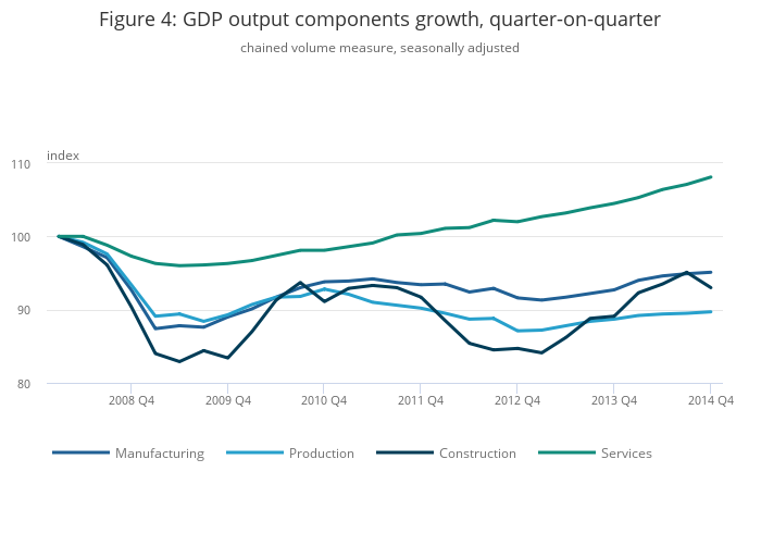 Construction output improved over much of 2014. However output declined in the most recent quarter. Although, there has been widespread growth across all major components of GDP since the start of 2013, the service industry remains the largest and steadiest contributor to overall economic growth, and is the only headline industry in which output has exceeded pre-downturn levels.