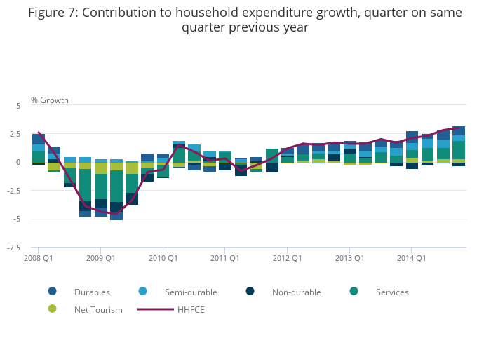 Image .csv .xlsFigure 7 shows the contribution of different categories of goods and services to the growth in UK household domestic expenditure growth, quarter on same quarter previous year. The positive consumption growth since Quarter 4 2011 is shown to have been broad based across both goods and services. The most notable change over recent periods is the return to a negative contribution from consumption of non durable goods. Between Quarter 4 2013 and Quarter 4 2014 consumption of non-durable goods has fallen by 1.2%. Non-durable goods include items which can only be consumed or used once; like food products.