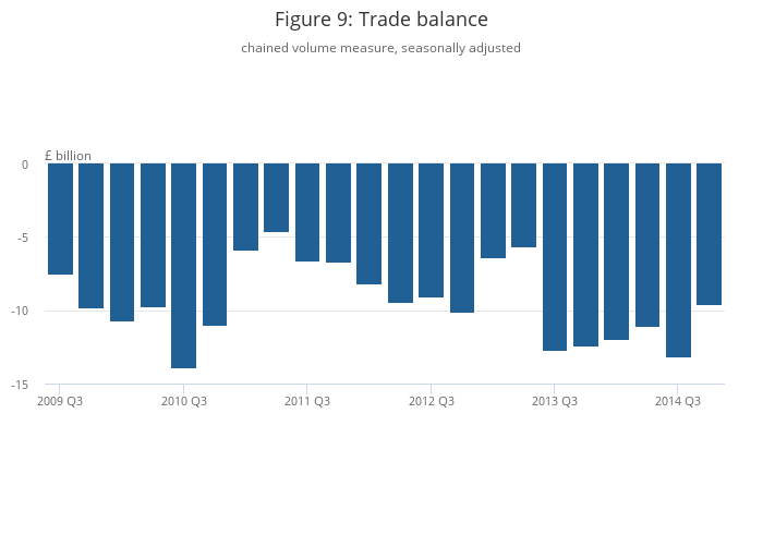 Trade in goods: Revisions from Quarter 1 2014 mainly reflect revised data from HM Revenue and Customs. Estimates of both exports and imports (see table 5), in current prices (CP) and chained volume measures (CVM), have been revised although, overall, exports more so with a £1.1 billion revision to the CVM estimate for 2014. A summary of the revisions is presented in the table below. The larger increase in exports (CVM) caused the trade in goods deficit to narrow to £30.6 billion in Quarter 4 (Oct to Dec) 2014. For both exports and imports, the revisions were due primarily to manufactured goods – particularly exports of material manufactures and imports of machinery and transport equipment.