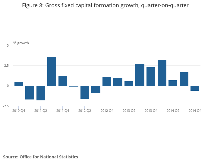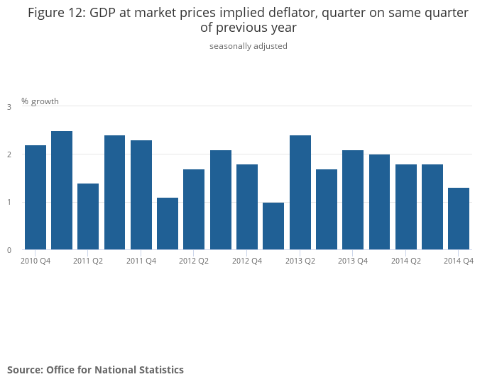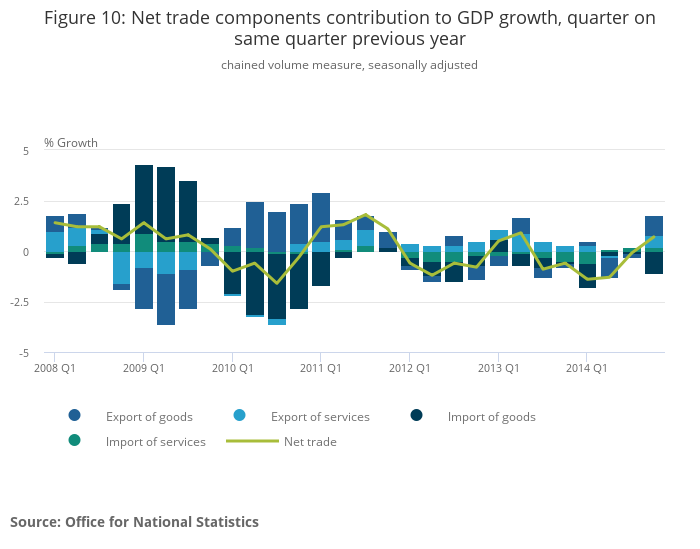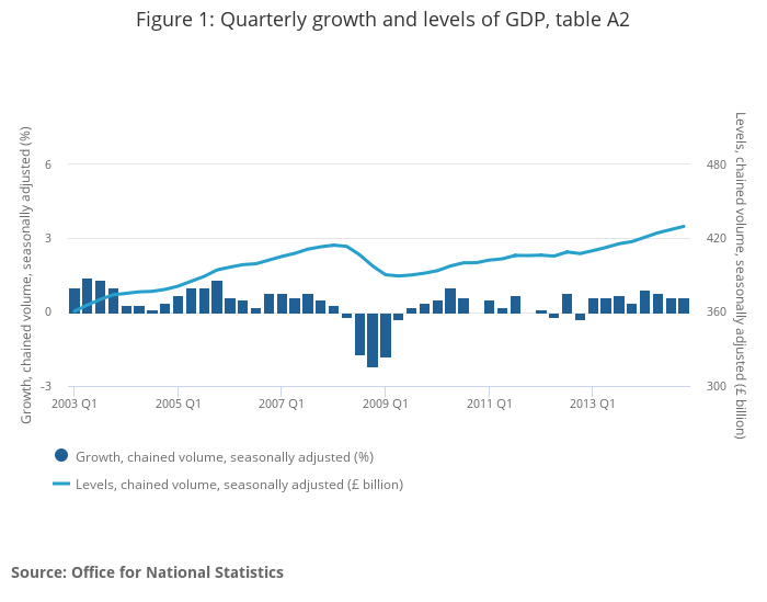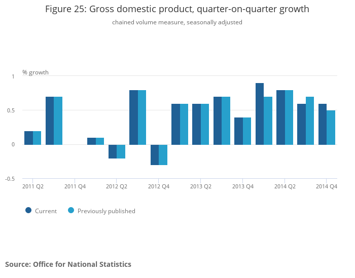 UK GDP in volume terms was estimated to have increased by 0.6% between Quarter 3 (July to Sept) 2014 and Quarter 4 (Oct to Dec) 2014, revised up 0.1 percentage points from the previous estimate of GDP published 26 February 2015
