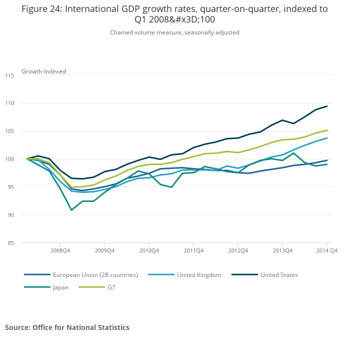 Image .csv .xlsFigure 24 shows GDP for the UK, EU, the USA and Japan, all indexed to Quarter 1 2008 (the pre-downturn peak in the UK) to allow comparison of each since that period.