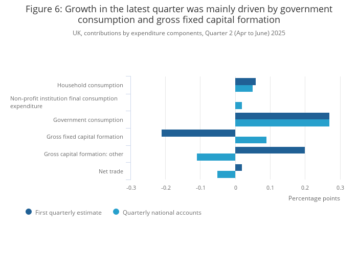 - UK gross domestic product (GDP) is estimated to have grown by an unrevised 0.3% in Quarter 2 (Apr to June) 2025, following an unrevised increase of 0.7% in Quarter 1 (Jan to Mar).