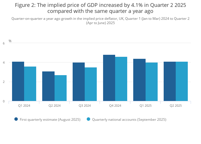 Compared with the same quarter a year ago, the GDP implied deflator grew by 4.1% in Quarter 2 2025. Across 2024 and 2025, there have been downward revisions to the GDP implied deflator (Figure 2). These mainly reflect a number of deflator improvements introduced as part of Blue Book 2025, in particular, where we have replaced selected import and export price indices with unit value indices based on HM Revenue and Customs (HMRC) data for basic commodities, including natural gas, crude oil, refined fuels and metals.