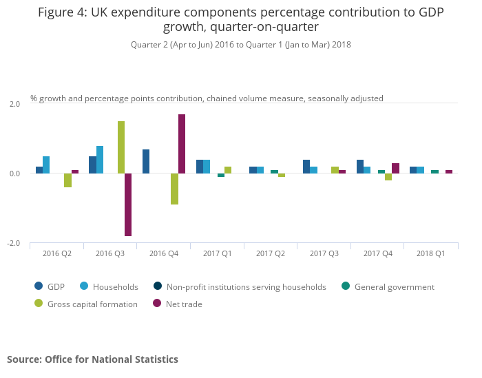 UK gross domestic product (GDP) increased by 0.2% between Quarter 4 (Oct to Dec) 2017 and Quarter 1 (Jan to Mar) 2018, revised upwards by 0.1 percentage points from the second estimate of GDP.