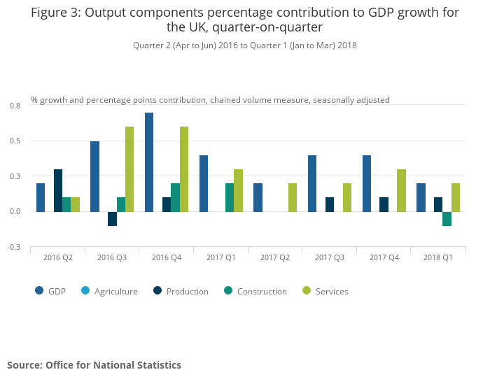 UK gross domestic product (GDP) in volume terms was estimated to have increased by 0.2% between Quarter 4 (Oct to Dec) 2017 and Quarter 1 (Jan to Mar) 2018; the 0.1 percentage points upward revision since the second estimate reflects improvements to the measurement of construction output.