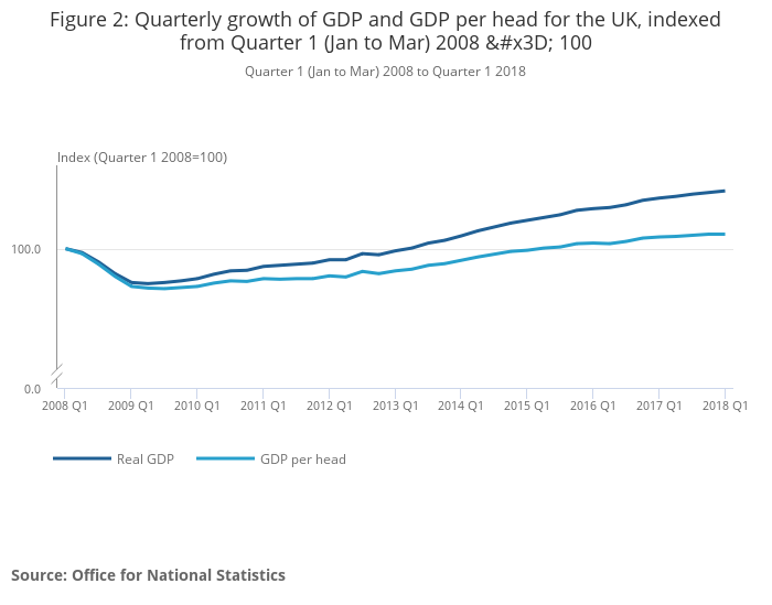 In Quarter 1 2018, GDP per head grew by 0.1% compared with Quarter 4 2017. GDP per head is now 2.6% above the GDP pre-economic downturn peak in Quarter 1 2008, having surpassed this peak in Quarter 2 2015 (Figure 2).
