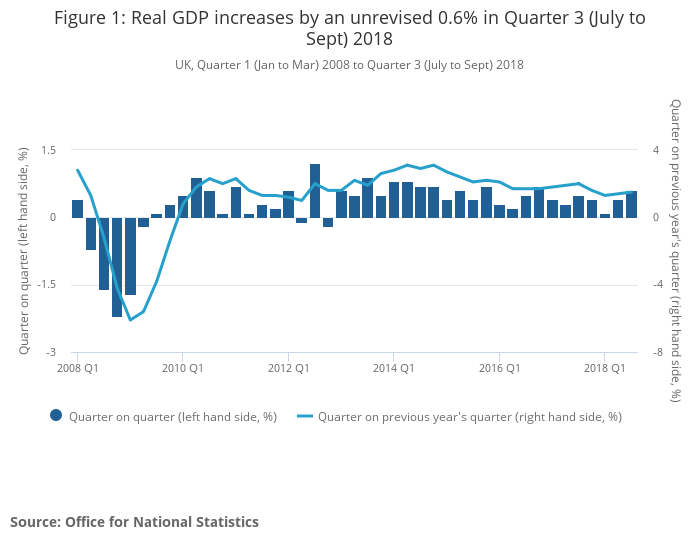 - UK economy grows by an unrevised 0.6% in Quarter 3 2018