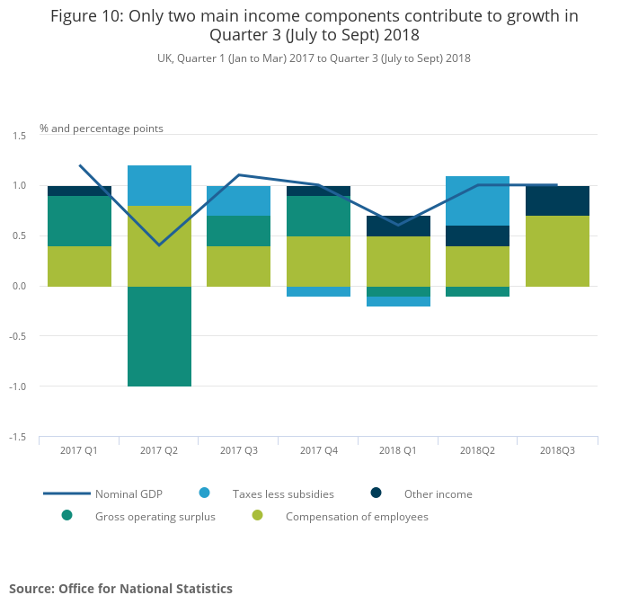 Quarterly growth in nominal GDP has continued to be driven by growth in compensation of employees (CoE), which increased by 1.4% in Quarter 3 2018. This marks its fastest rise in over a year, reflecting an increase in both wages and salaries and in employers’ social contributions. This is reflected in the latest labour market data, which shows that nominal regular wage growth increased by 3.3% in the year to the three months to October 2018, the fastest rate of growth since late 2008. Gross operating surplus of corporations increased by 0.1% in Quarter 3, revised from the previous estimate of 1.4% – see Section 7 for more information on revisions. Please see the Quality and methodology section for further information about the balancing adjustments applied to this dataset.