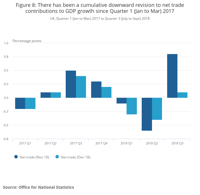 There have also been improvements incorporated into the trade figures published here, including the incorporation of the annual benchmark of the International Trade in Services survey for 2017 and the replacement of forecast with actual IPS data, which is used to record the exports and imports of travel services. Today’s nominal estimates also include the processing of the latest estimates of financial services. In addition to these nominal changes, there have also been improvements to a number of goods deflators, aimed at capturing more accurately the price movements of exports and imports. This has led to additional revisions feeding through into the volume estimates of exports and imports. Figure 8 shows the revisions to the net trade contributions to GDP growth since Quarter 1 2017. The cumulative effect over this period has been for net trade to have contributed less than previously estimated, most notably in the latest quarter in which net trade is now estimated to have contributed 0.1 percentage points to GDP growth in Quarter 3 2018. This is revised down from 0.8 percentage points and mainly reflects updated estimates of unspecified goods (which contains NMG).