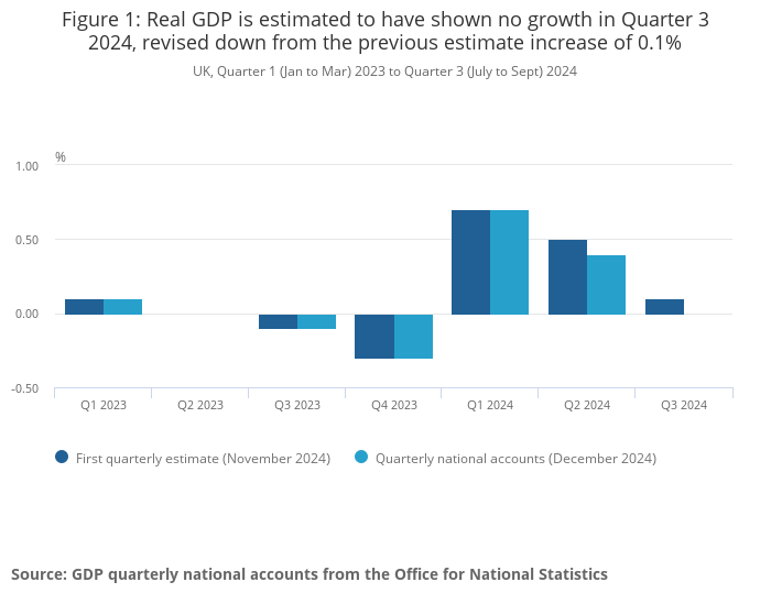 UK real gross domestic product (GDP) is estimated to have shown no growth in Quarter 3 (July to Sept) 2024, revised down from the first estimate increase of 0.1%.