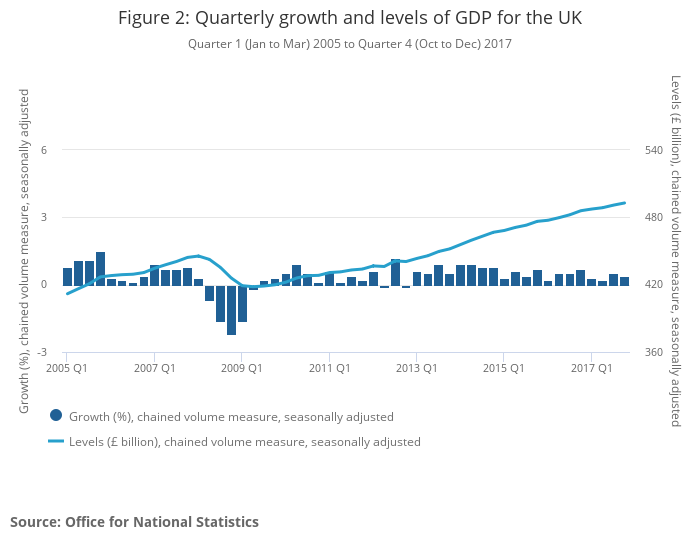 UK gross domestic product (GDP) increased by 0.4% between Quarter 3 (July to Sept) 2017 and Quarter 4 (Oct to Dec) 2017.