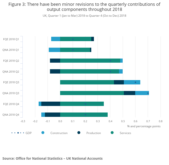 Nôl i'r tabl cynnwys3. The UK economy slows to 0.2% in Quarter 4 2018, unrevised from the first quarterly estimate