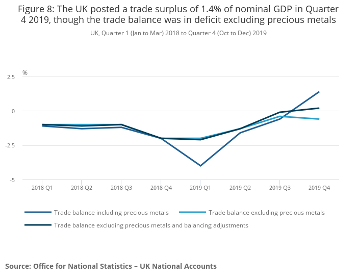 Figure 8: The UK posted a trade surplus of 1.4% of nominal GDP in Quarter 4 2019, though the trade balance was in deficit excluding precious metals