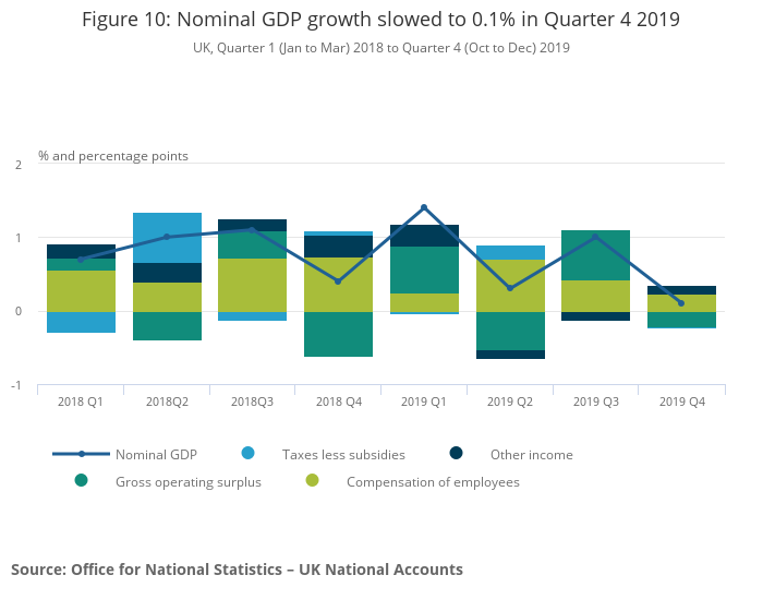 Nominal gross domestic product (GDP) grew by an unrevised 0.1% in Quarter 4 (Oct to Dec) 2019, following an increase of 1.0% in the previous quarter (Figure 10). This is the weakest quarterly figure since Quarter 2 2011. Nominal GDP growth in the second quarter was revised down by 0.1 percentage points whilst growth in the third quarter was upwardly revised by 0.1 percentage points.