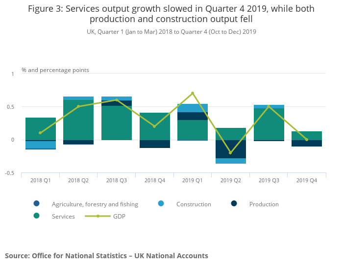 The services sector provided a positive contribution to growth in the output approach to GDP in Quarter 4 2019, however, this was offset by a negative contribution from the production sector.