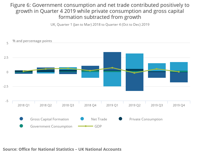 There were increased challenges around balancing GDP growth for Quarter 4 (Oct to Dec) 2019, in part because of heightened uncertainty around the impact of the UK’s planned exit from the EU on the activity of businesses. This has been reflected in the adjustments that have been applied to the expenditure estimates. For this reason, we recommend the breakdown of the expenditure approach to GDP is considered in the context of these adjustments. Further information on these adjustments is available in the Quality and methodology section.
