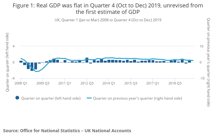 UK gross domestic product (GDP) in volume terms was flat in Quarter 4 (Oct to Dec) 2019, unrevised from the first quarterly estimate.