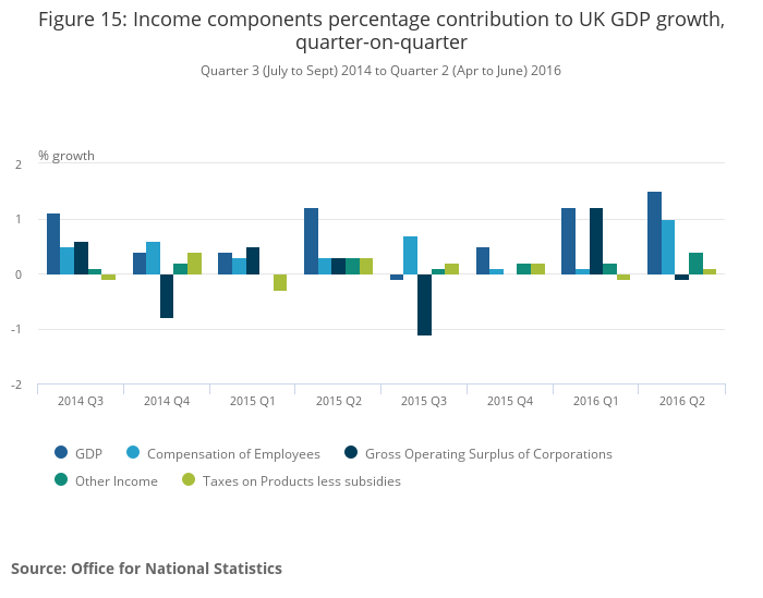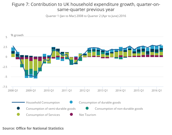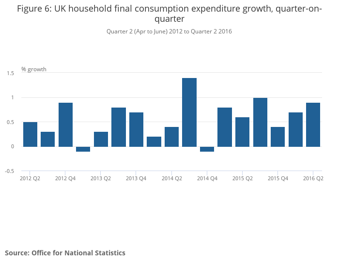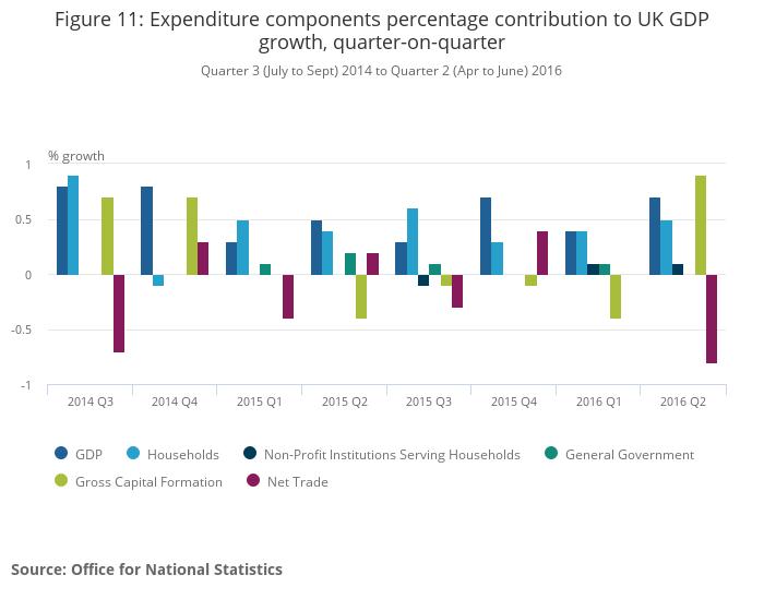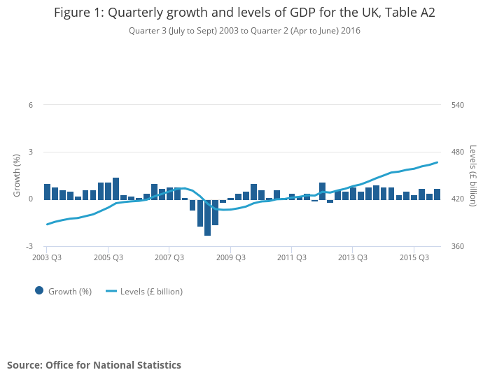 UK GDP in volume terms was estimated to have increased by 0.7% in Quarter 2 2016, revised up 0.1 percentage points from the second estimate of GDP published on 26 August 2016. This is the 14th consecutive quarter of positive growth since Quarter 1 (Jan to Mar) 2013.