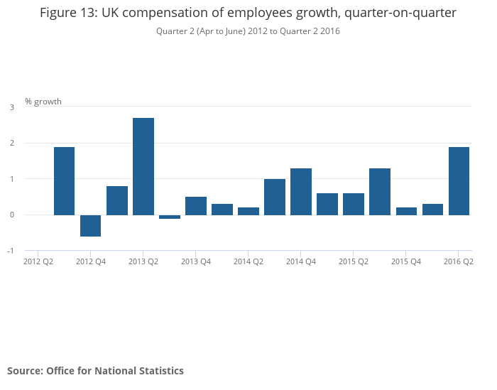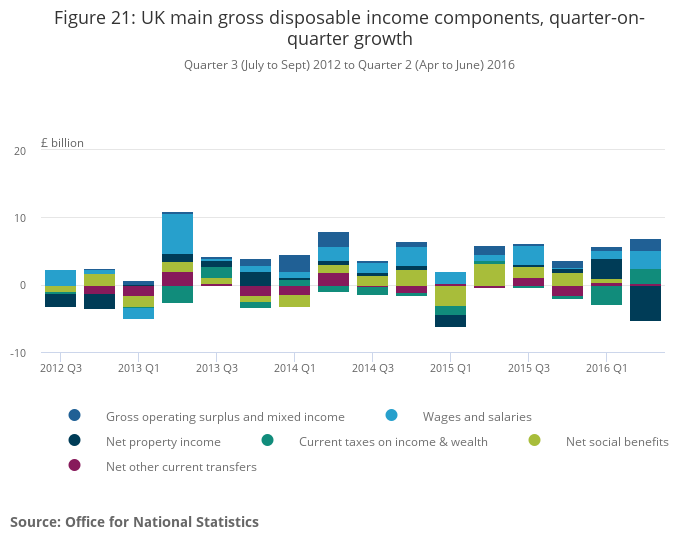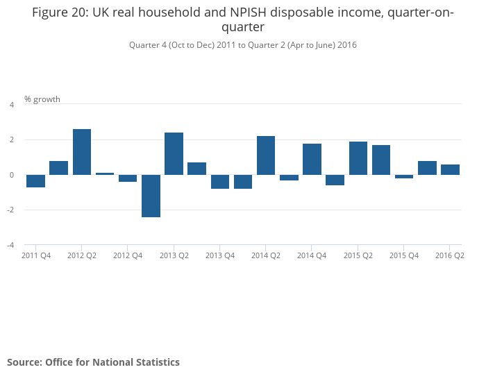 The level of real households and NPISH disposable income increased by 0.6% in Quarter 2 (Apr to June) 2016, following an increase of 0.8% in the previous quarter (Figure 20).