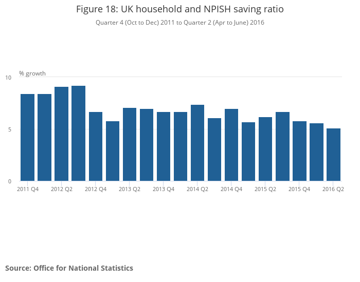 The households and non-profit institutions serving households saving ratio was estimated to be 5.1% in Quarter 2 2016 compared with 5.6% in Quarter 1 2016. In 2015, the saving ratio was estimated to be 6.1%.