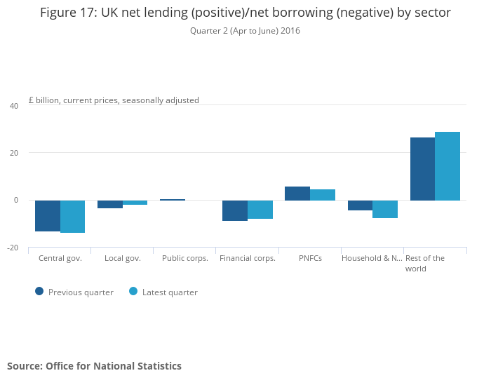 In Quarter 2 (Apr to June) 2016, the central government, local government, public corporations, financial corporations and households and non-profit institutions serving households sectors were net borrowers. The private non-financial corporations and rest of the world sectors were net lenders (Figure 17).