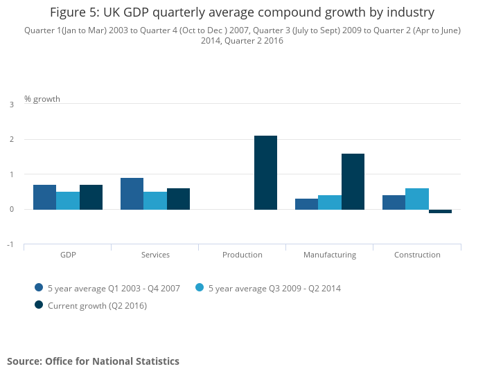 Quarter 2 2016 has shown continued strength with GDP growing by 0.7% compared with the previous quarter and by 2.1% between Quarter 2 2015 and Quarter 2 2016. GDP has now increased for 14 consecutive quarters, breaking a pattern of slow and erratic growth from 2009.