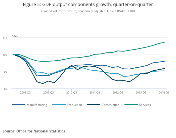 Production activity began to grow again in 2010, with the manufacturing and construction industries showing particular strength, but neither industry sustained this growth. Production output fell in both 2011 and 2012, falling below levels seen at the height of the downturn in 2009. Construction output also decreased sharply in 2012, with output close to its 2009 trough after further contraction in Q1 2013. However, clear improvement in this industry can be observed throughout 2014. Although there has been widespread growth across all major output components of GDP since the start of 2013, the service industries remain the largest and steadiest contributor to economic growth and the only component of GDP where output has exceeded pre-downturn levels.
