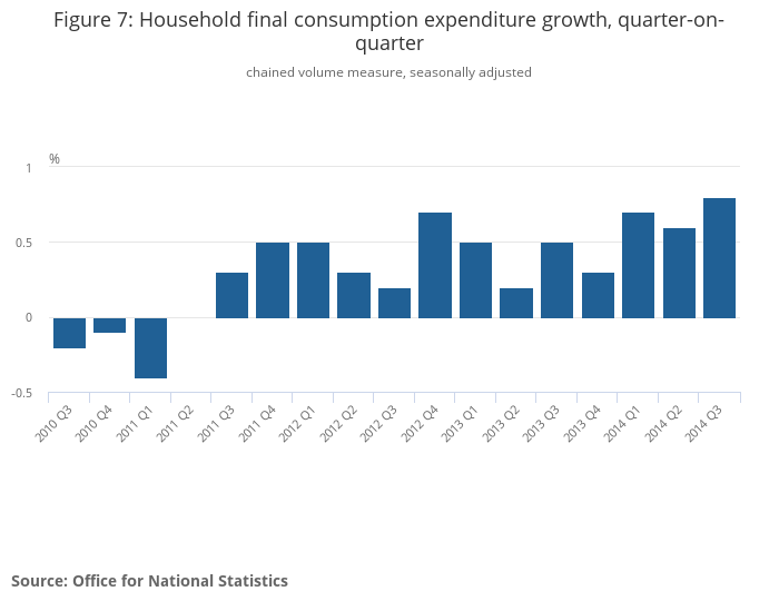 Gross domestic expenditure (the sum of all expenditure by UK residents on goods and services which is not used up or transformed in a productive process) rose by 1.2% in Q3 2014, following a 1.0% increase in Q2 2014.