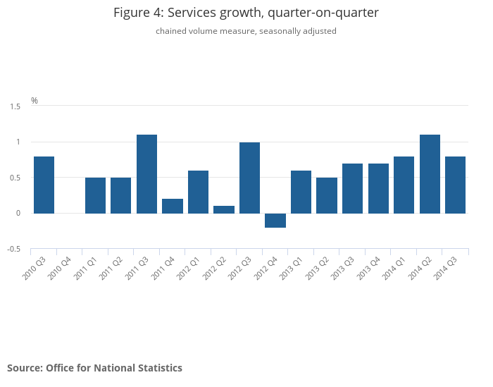 The service industries grew by 0.8% in Q3 2014 (see Figure 4), revised up 0.1 percentage points from the previous estimate, marking the seventh consecutive quarter of positive growth. This follows a 1.1% increase in Q2 2014. The increase in the latest quarter was broad-based; the largest contributions coming from the business services & finance and transport, storage & communications industries, which grew by 1.1% and 1.3% respectively.
