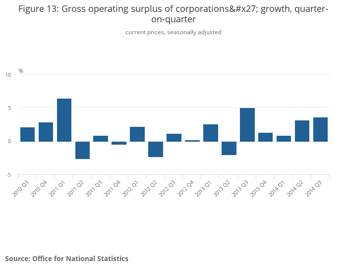 Image .csv .xlsThe gross operating surplus of corporations – effectively the profits of companies operating within the UK – including the alignment adjustment, rose by 3.6% in Q3 2014 compared with the previous quarter; this follows an increase of 3.2% in Q2 2014 (see Figure 13).