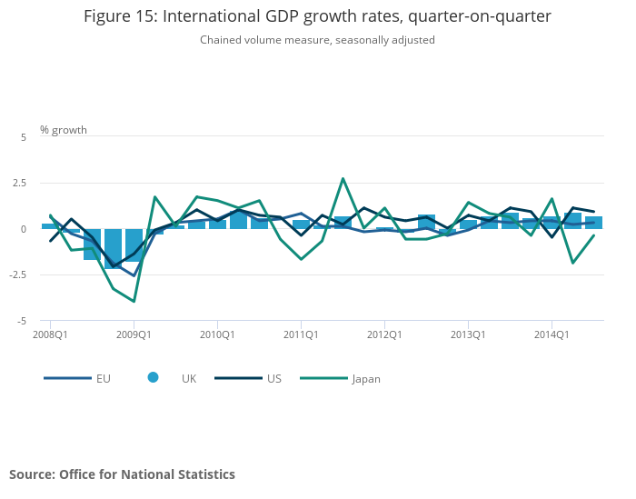 In Q3 2014, GDP for the Eurozone quarter-on-quarter increased by 0.2%, while GDP for the European Union (EU 28) grew by 0.3% (see Table 2 and Figure 15). This is the sixth consecutive quarter of growth for the EU28 economy. When compared to Q3 2013, GDP for the Eurozone expanded by 0.8%, while GDP for the EU28 increased by 1.3% (see Figure 16). France and Germany grew by 0.3% and 0.1% respectively in Q3 2014, following contractions of 0.1% for both economies in Q2 2014. Following a 1.1% increase in Q2 2014, GDP for the United States of America rose by 0.9% in Q3 2014. GDP for the United States of America grew by 2.3% between Q3 2013 and Q3 2014. The Japanese economy contracted by 0.4% in Q3 2014, following a contraction of 1.9% in Q2 2014.