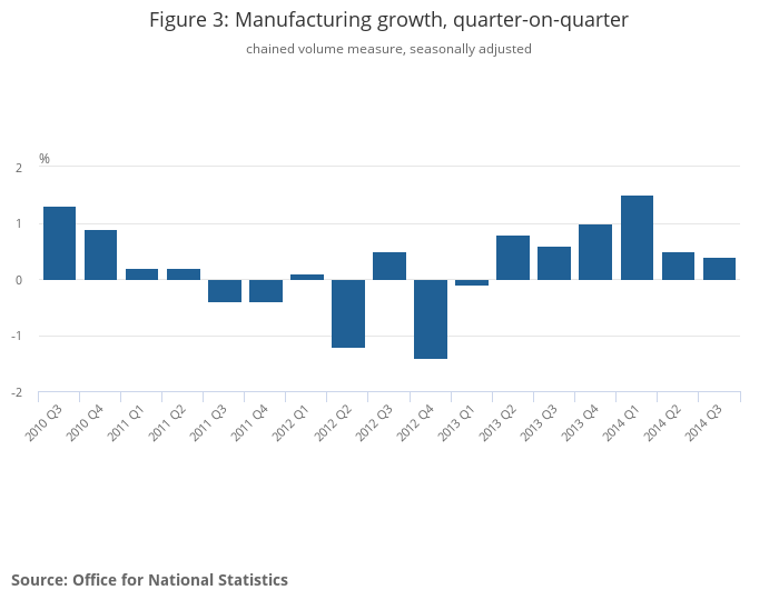 Production output increased by 0.2% in Q3 2014 compared with Q2 2014. However, there was a mixed performance within sub-industries. Output from mining and quarrying including oil & gas extraction fell by 1.7%, the largest fall within production, while water supply & sewerage fell by 0.4% on the quarter. Manufacturing (the largest component of production) and electric, gas, steam & air industries both rose on the quarter, increasing by 0.4% and 2.6% respectively, with the former contributing most to the positive growth in production.