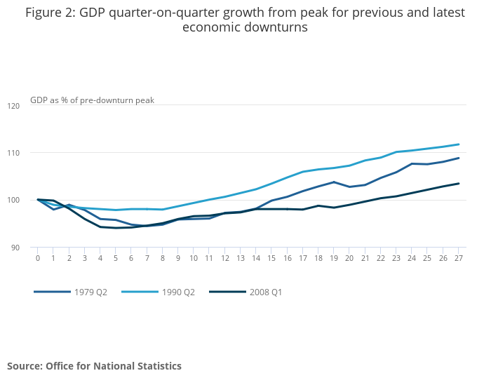 Figure 2: GDP quarter-on-quarter growth from peak for previous and latest economic downturns