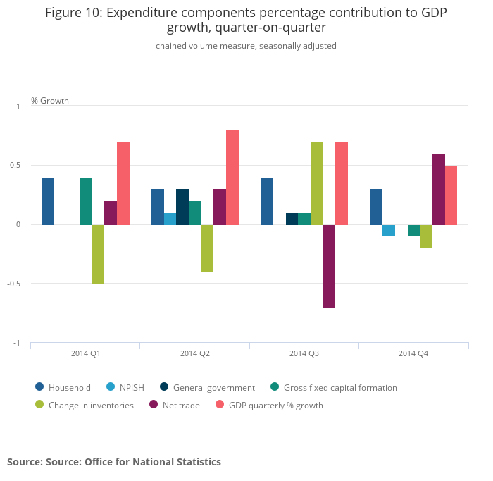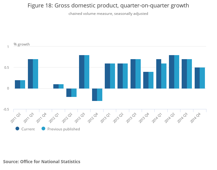 UK gross domestic product (GDP) in volume terms was estimated to have increased by 0.5% between Q3 2014 and Q4 2014, unrevised from the previous estimate of GDP published 27 January 2015