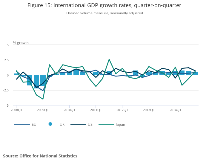 GDP for the United States of America rose by 0.7%, a slightly lower increase than the previous two quarters, which saw GDP increasing by 1.2% in Q3 2014 and 1.1% in Q2 2014. Between Q4 2013 and Q4 2014, GDP for the United States of America rose by 2.5%. Q4 2014 saw positive 0.6% growth for the Japanese economy, following contraction in the previous two quarters. Between Q4 2013 and Q4 2014, GDP for Japan fell by 0.4%.
