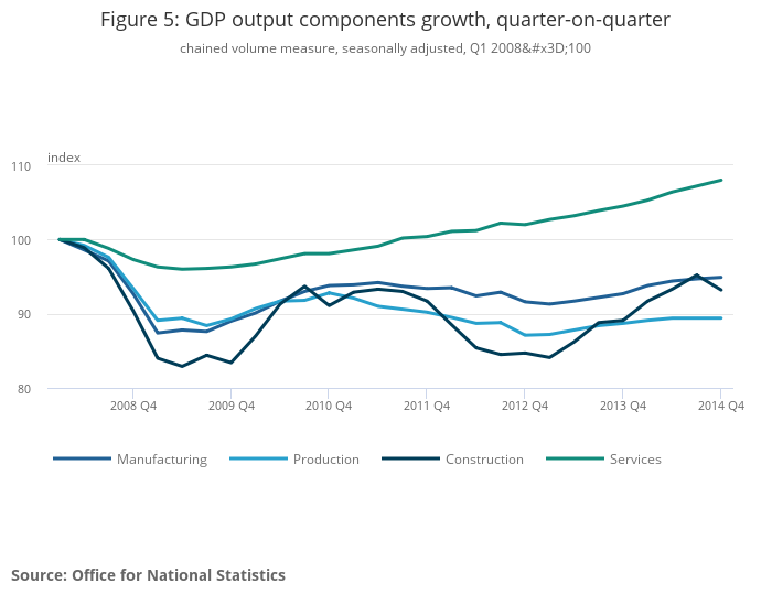 Production activity began to grow in 2010 - with manufacturing and the construction industry showing particular strength - but both industries did not sustain this growth. Production output fell in both 2011 and 2012, falling below levels seen at the depth of the downturn in 2009. Construction output also fell sharply in 2012, with output falling close to its 2009 trough following further contraction in Q1 2013. Construction output improved over much of 2014; however output declined in the most recent quarter. Although there has been widespread growth across all major components of GDP since the start of 2013, the service industries remain the largest and steadiest contributors to overall economic growth and are the only headline industries in which output has exceeded pre-downturn levels.
