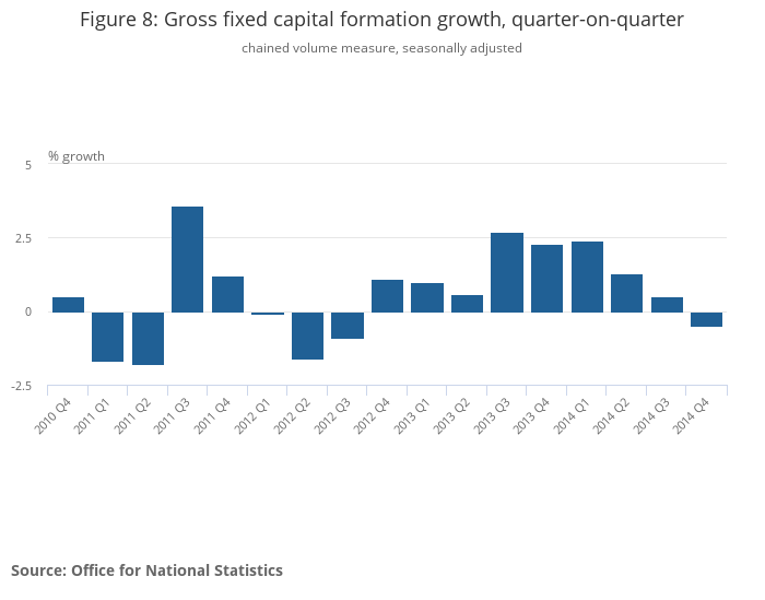 In Q4 2014, gross fixed capital formation was estimated to have decreased by 0.5% (see Figure 8). Business investment was estimated to have fallen by 1.4% in Q4 2014. A large part of the fall in business investment came from a fall in investment by the oil and gas extraction industry.