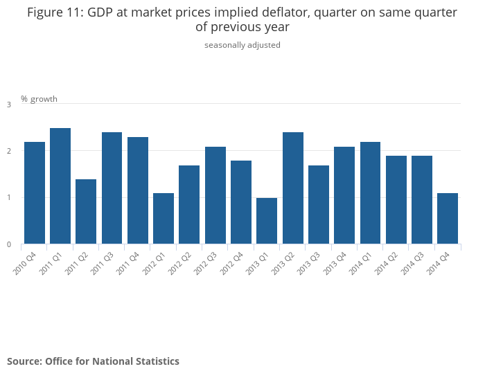 The gross domestic product implied deflator at market prices for Q4 2014 is 1.1% above the same quarter of 2013 (see Figure 11). The GDP implied deflator is calculated by dividing current price (nominal) GDP by chained volume (real) GDP and multiplying by one hundred to convert to an index. It is not used in the calculation of GDP; the deflators for expenditure components, which are the basis for the implied GDP deflator, are used to calculate nominal GDP not real GDP.