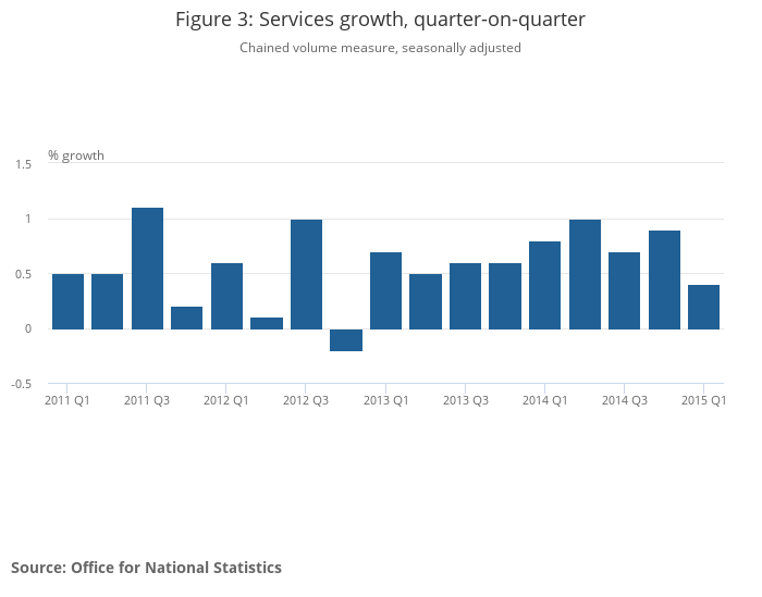 The service industries grew by 0.4% in Quarter 1 2015 (Figure 3), revised down 0.1 percentage points from the previous estimate, marking the ninth consecutive quarter of positive growth. This follows a 0.9% increase in Quarter 4 2014.