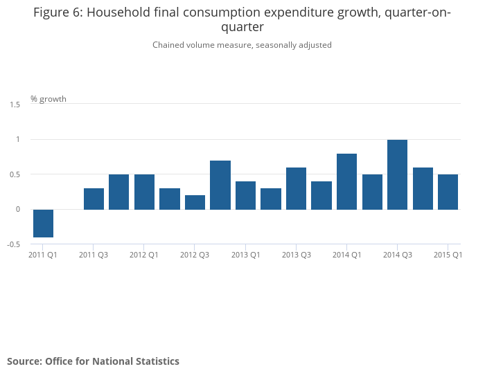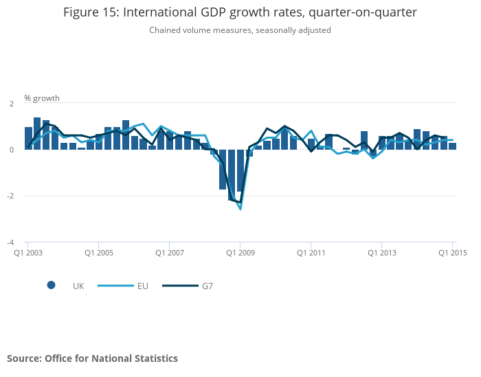 UK GDP in volume terms was estimated to have increased by 0.3% between Quarter 4 (Oct to Dec) 2014 and Quarter 1 (Jan to Mar) 2015, unrevised from the previous estimate of GDP published 28 April 2015