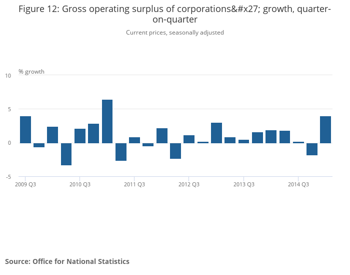 Image .csv .xlsThe gross operating surplus of corporations (effectively the profits of companies operating within the UK), including the alignment adjustment, rose by 4.0% in Quarter 1 2015 compared with the previous quarter; this follows a decrease of 1.8% in Quarter 4 2014 (Figure 12). Between 2013 and 2014 the gross operating surplus of corporations rose by 4.6%.
