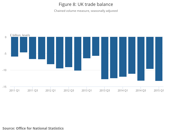 The trade balance deficit widened from £9.6 billion in Quarter 4 2014 to £13.2 billion in Quarter 1 2015 (Figure 8). The trade position reflects exports minus imports. Following a 4.6% increase in Quarter 4 2014, exports fell by 0.3% in the latest quarter, while imports increased by 2.3% following a 1.6% increase in Quarter 4 2014. Between 2013 and 2014, exports increased by 0.6% while imports increased by 2.2%.