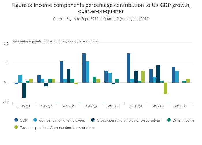 The income approach to measuring GDP involves estimating all income generated through production within the UK economy. It increased by 0.3% in chained volume measures (0.8% in current prices seasonally adjusted) between Quarter 1 (Jan to Mar) 2017 and Quarter 2 (Apr to June) 2017.
