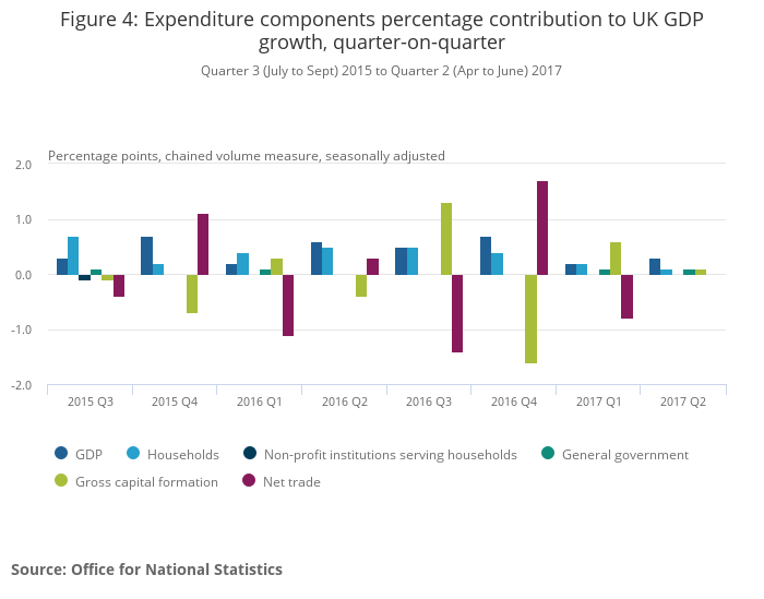 The expenditure approach to measuring GDP involves estimating all final expenditures within the UK economy. This measure increased by 0.3% between Quarter 1 (Jan to Mar) 2017 and Quarter 2 (Apr to June) 2017.