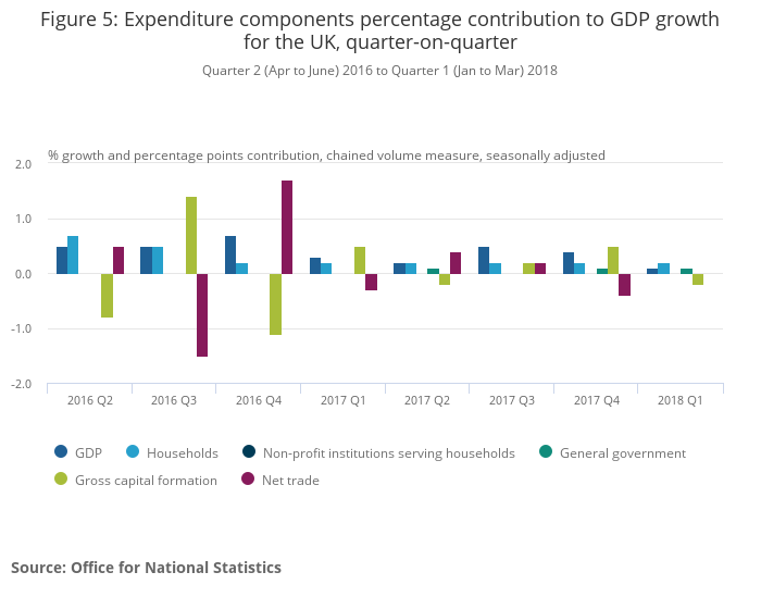UK gross domestic product (GDP) in volume terms was estimated to have increased by 0.1% between Quarter 4 (Oct to Dec) 2017 and Quarter 1 (Jan to Mar) 2018, unrevised from the preliminary estimate of GDP.
