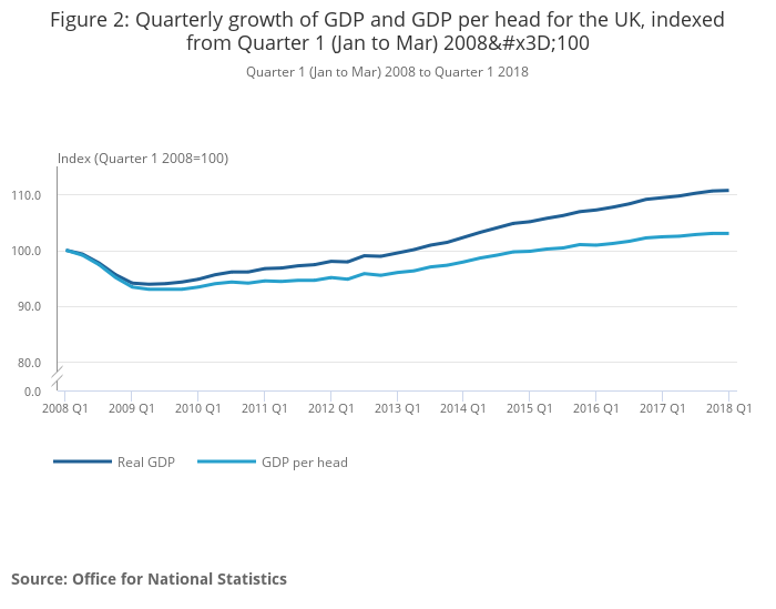 In Quarter 1 2018, GDP per head fell by 0.1% compared with Quarter 4 2017, reflecting population increasing at a greater rate than GDP. GDP per head is now 3.0% above the GDP pre-economic downturn peak in Quarter 1 2008, having surpassed this peak in Quarter 2 2015 (Figure 2).